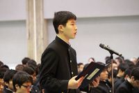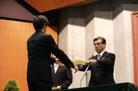 式典には、2012年9月まで本校で校長を務められた下村裕慶應義塾大学法学部教授もお祝いに駆けつけてくださいました。式典後は、本校の同窓会組織である慶應志木会への入会セレモニーと、志木高在学中の顕著な活躍に対して贈られる「慶應志木会賞」の授与も行われ、下村前校長も含めて記念撮影が行われました。