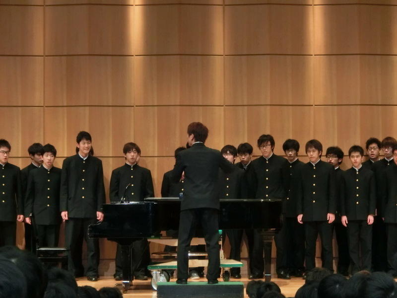 最後に、毎年恒例となっている自由選択科目「芸術A」の選択者による男声合唱の発表がありました。「Sound Celebration」「今年」「いざ起て戦人よ」「慶應義塾塾歌」の4曲を披露してくれましたが、今年は指揮・ピアノ伴奏・司会のすべてを生徒が担当し、完成したステージをみせてくれました。
