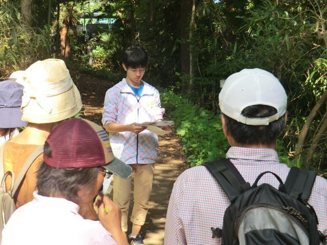 観察会は、いつも通り14:00-16:00の2時間にわたって行われました。3年目に突入したオープンスタイル(参加者に校内を自由に散策していただく形)の観察会で、本校3年生の生物履修者がインストラクターとして要所要所に立って、訪れた参加者の方々に周囲の植物について解説を行いました。