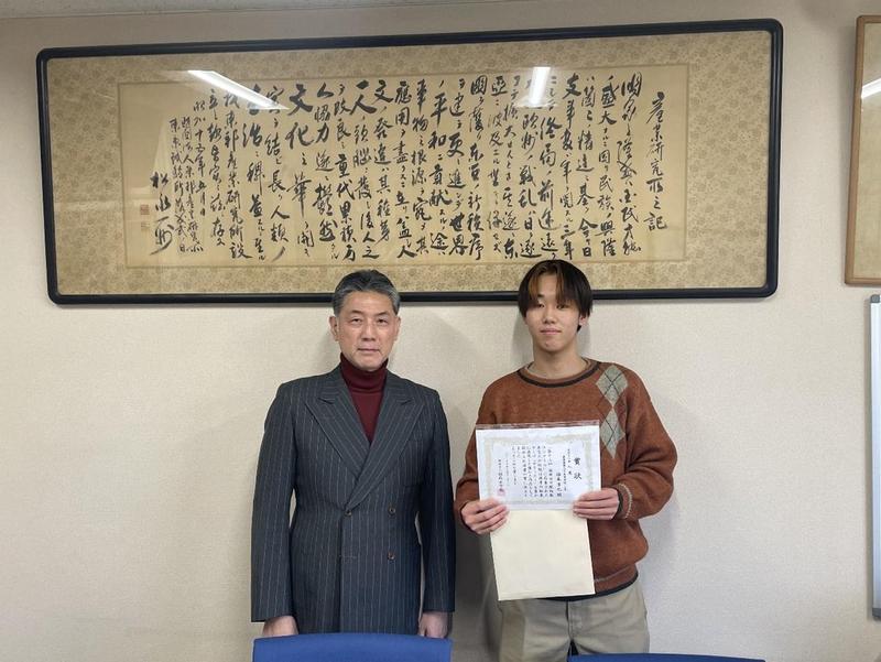 このたび、本校2年生の福本 朝靄 君(筆名、本名隼也)、島田 二 君(筆名)の短歌が、第12回福岡女学院短歌コンクールで入選いたしました(右は本校校長河野文彦先生と福本君の記念写真)。