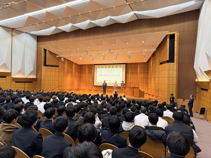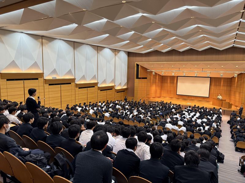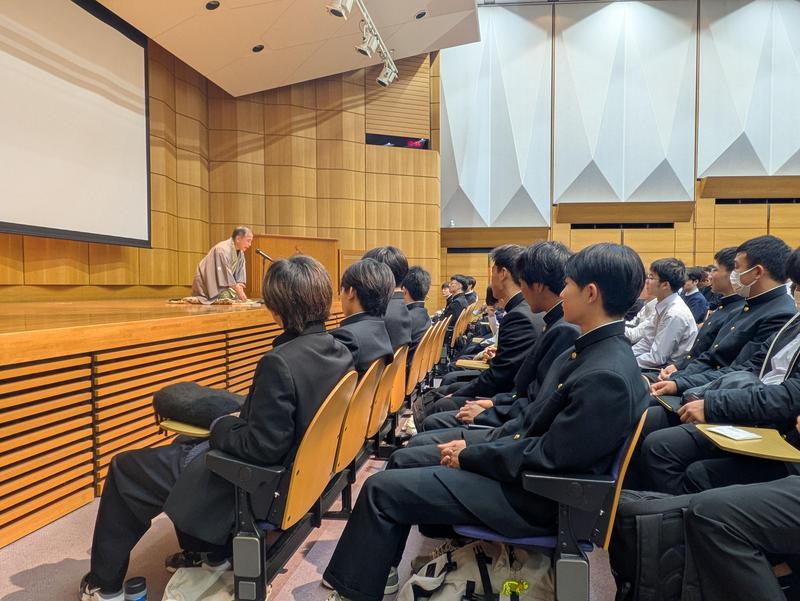 2025年12月19日(金)、三田キャンパス西校舎ホールにて、第139回志木演説会が開催されました。落語立川流真打で著述家である立川談慶氏をお招きし、「落語から学ぶコミュニケーション」という演題でお話しいただきました。実は本校卒業生のお父君であり、ご子息(優都君)による愛情たっぷりの「他己紹介」で始まりました。談慶氏は、安定した会社員を辞めて芸の道に入り、塾員で初めて真打となったパイオニアです。立川談志師匠の元での「前座9年半」という厳しくも人情味溢れる日々については、〈本格派(本書く派)落語家〉である談慶氏の多くのご著書(『狂気の気づかい――伝説の落語家・立川談志に最も怒られた弟子が教わった大切なこと』など)で触れられていますが、これから自分の人生と向き合っていく本校生徒にとって大切なヒントになるお話を、盛沢山の笑いを挟みながら披露してくださいました。