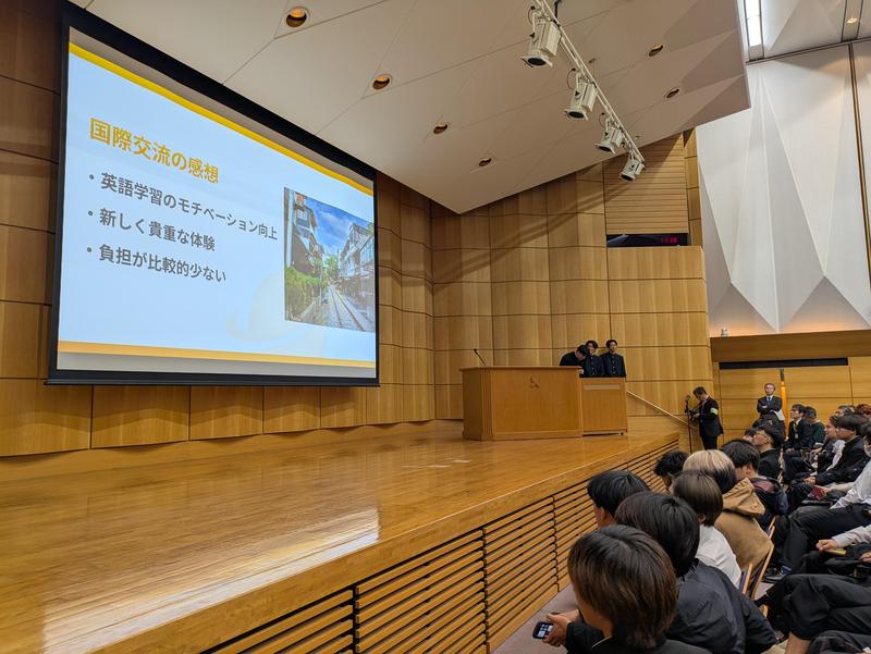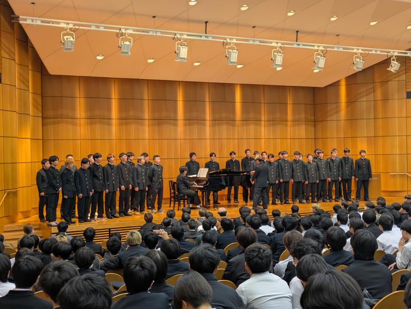 演説会終了後、大竹音色講師担当の自由選択科目「芸術A」履修生徒による合唱が披露され、その後、国際交流に参加した生徒から、台湾、オーストラリアそれぞれの交流の内容が紹介されました。また、全国大会に出場する蹴球部と端艇部、英語コンテストで優秀 な成績を修めた生徒の表彰がありました。