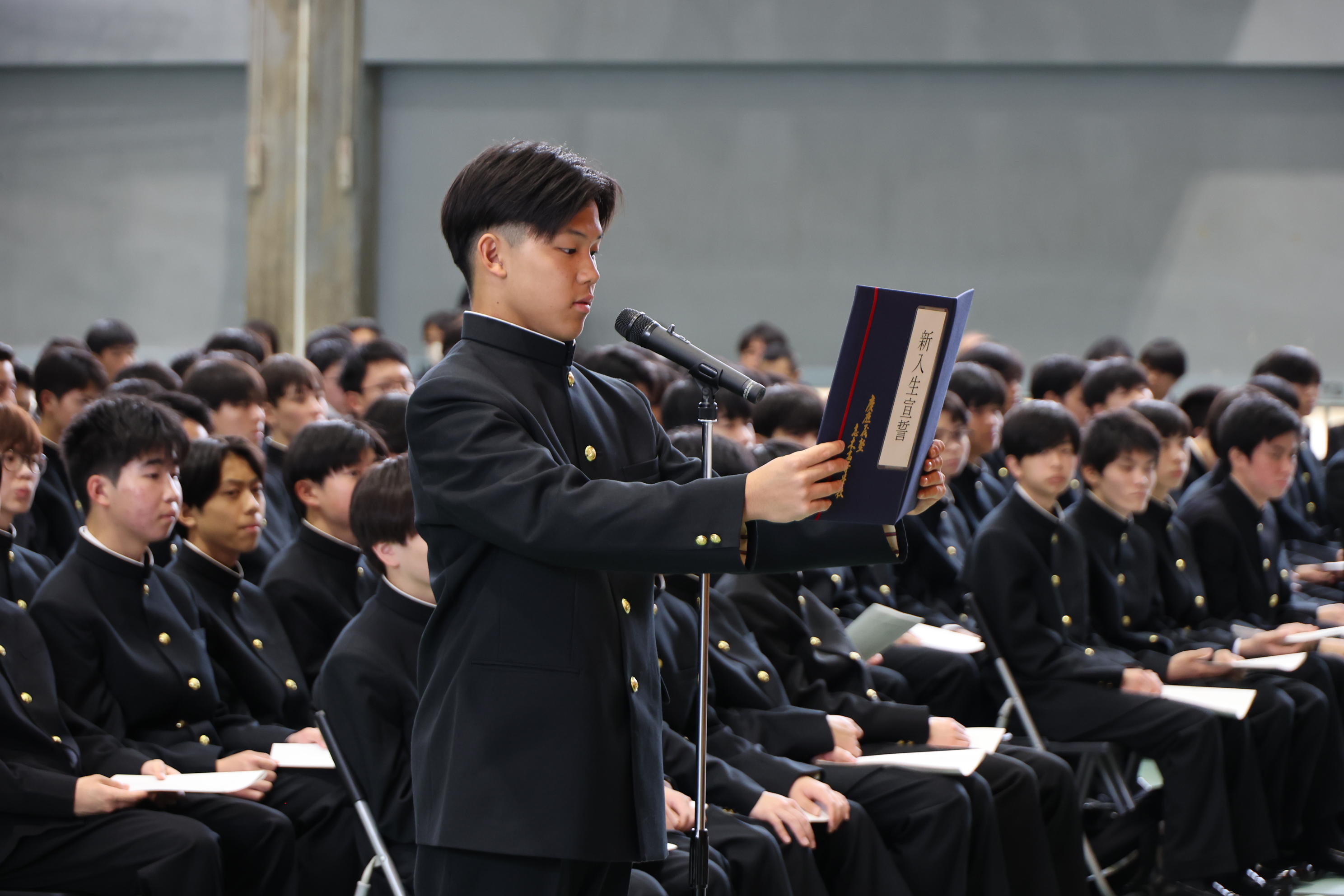 式典には、新入生、新入生保護者、教職員が一堂に会しました。前北馨主事による学事報告に続いて、河野文彦校長による式辞、伊藤公平塾長による祝辞、1年A組森悠樹君による新入生宣誓があり、器楽部の伴奏、ワグネル・ソサィエティー男声合唱団のリードで「塾歌」を斉唱しました。